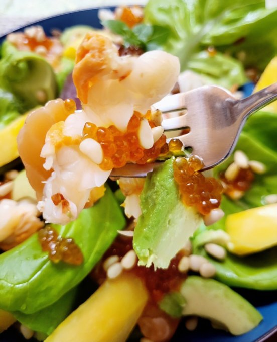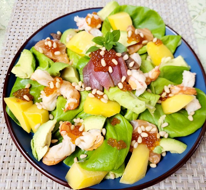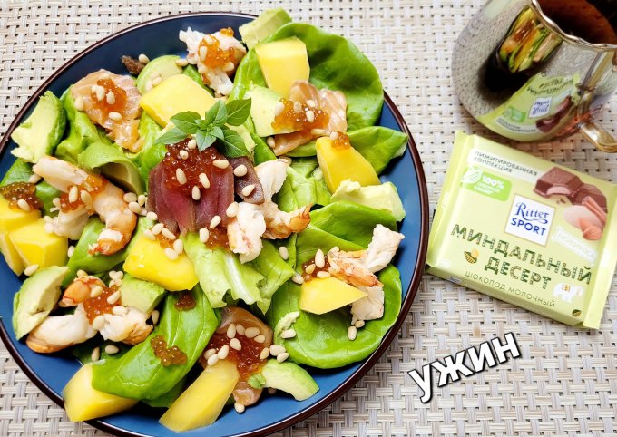 | Салат, аргентинская креветка, лосось, тунец, икра горбуши, авокадо, манго, кедровый орех |