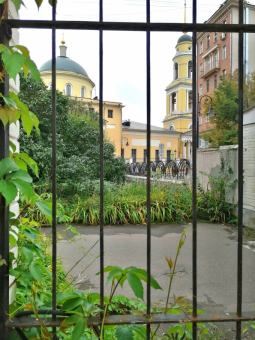 немного пройти. Через решётку ограды вид на церковь, где венчался