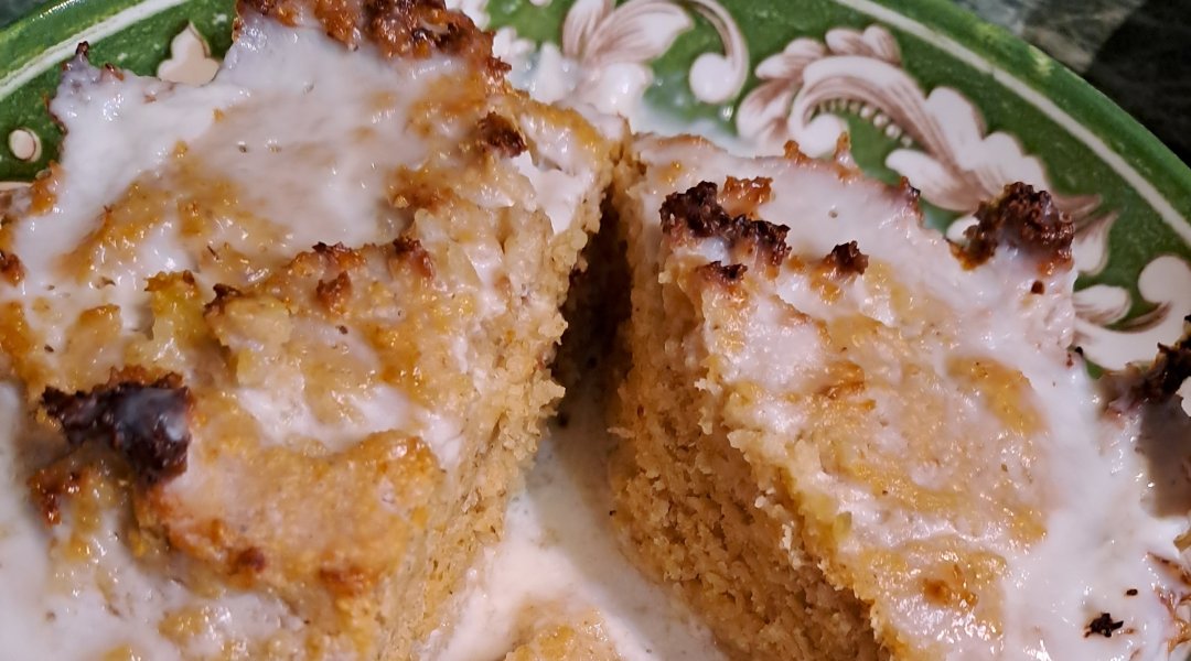 Геркулес смолоть до состояния муки, кружочки ананаса смолоть отдельно, добавить 3 яйца, разрыхлителя, ванилин, смешать с мукой геркулес, добавить мягкий творог, дать постоять 10 минут, выпекать 50 минут при температуре 180°С, после выпечки залить смесью сока ананаса и сгущенки