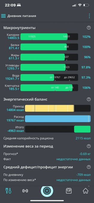 Среднесуточная калорийность недельного рациона - 2115 ккал ( пока