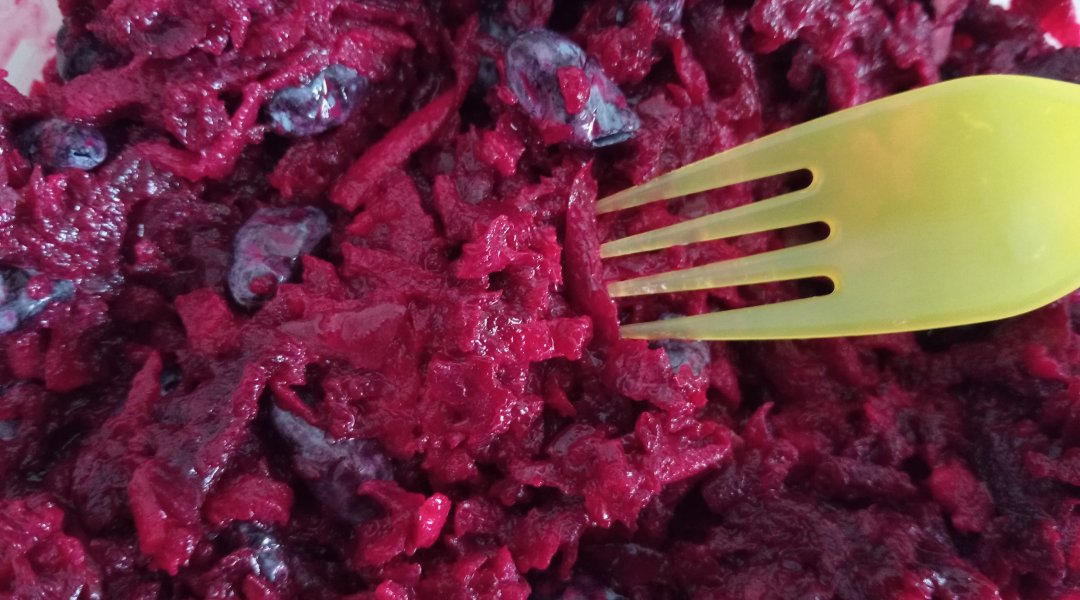 Варёную свеклу и сладкое яблоко потереть на крупной тёрке, добавить жимолость (у меня замороженная) и сметану. Приятного аппетита!
