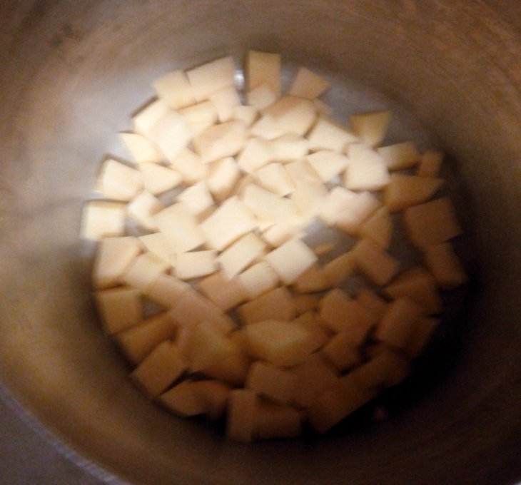 порезать кубиками. Сложить в кастрюлю. Залить водой так, чтобы не