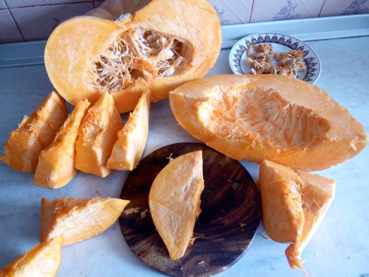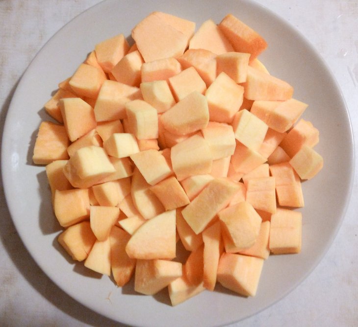 Картофель вымыть, почистить порезать кубиками. Тыкву почистить,