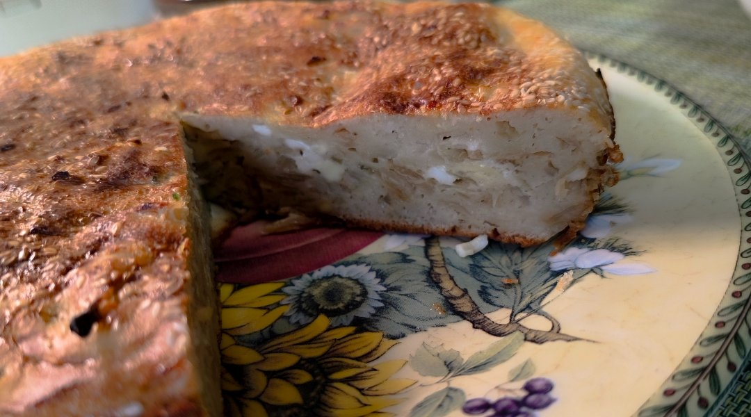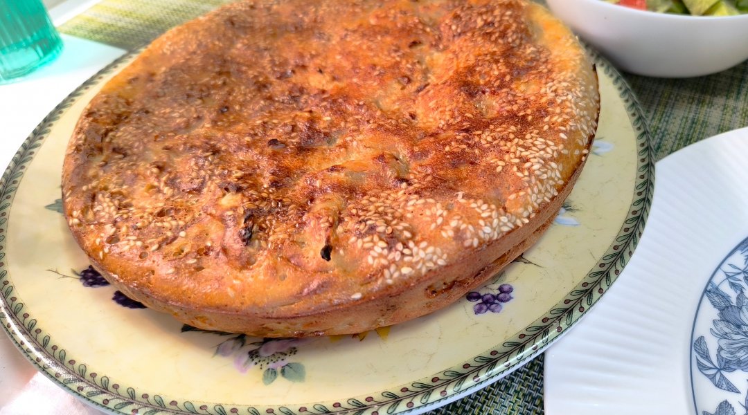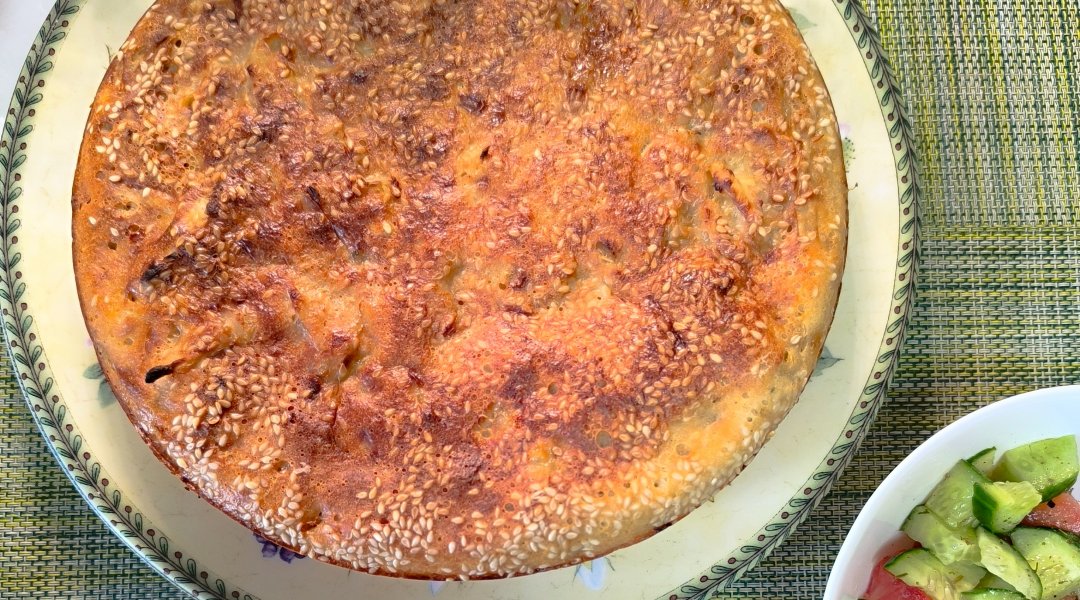 вылить вторую часть. Посыпать пирог сверху кунжутом.