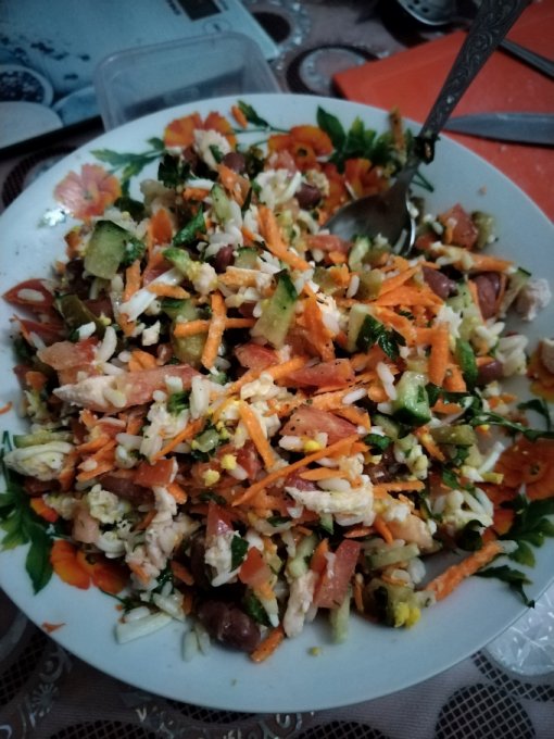 | Салат рис грудка яйцо фасоль морковь капуста пекинская огурец зелень |
