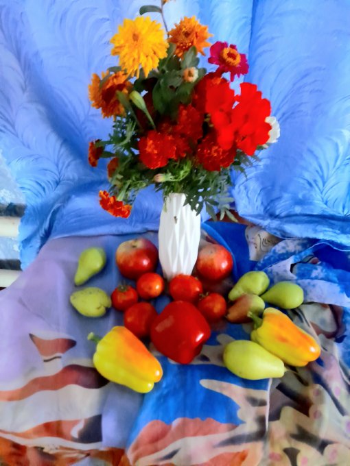 Решила сделать осенний натюрморт, по классике, должны быть опавшие лепестки на фруктах, овощах, я не стала из свежих цветов выщипывать лепестки, пусть у меня будет так🤗