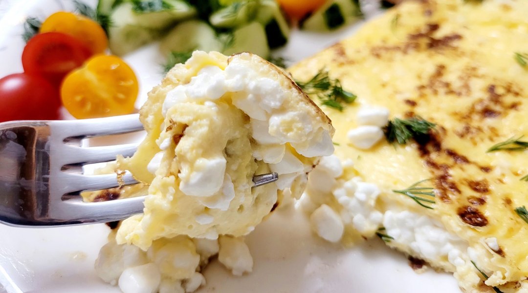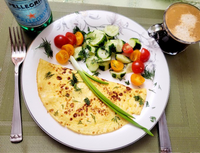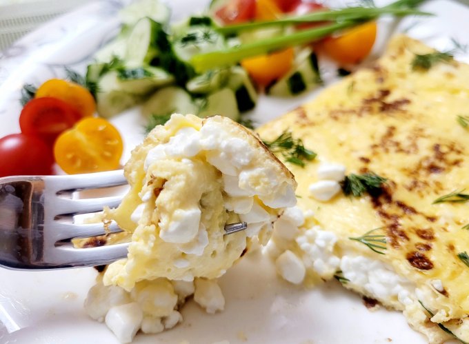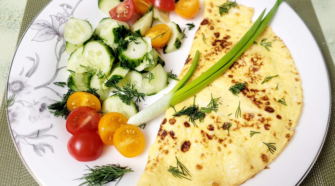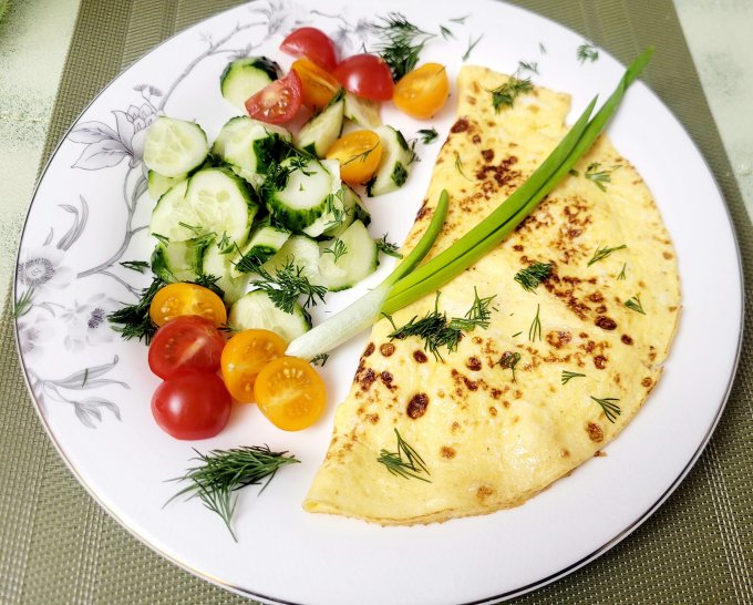 | Омлет с творогом,огурец,помидор,зелень |