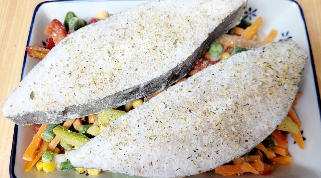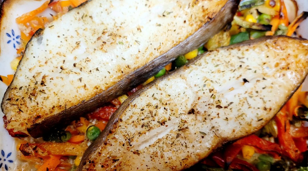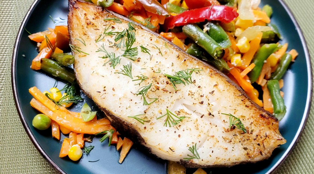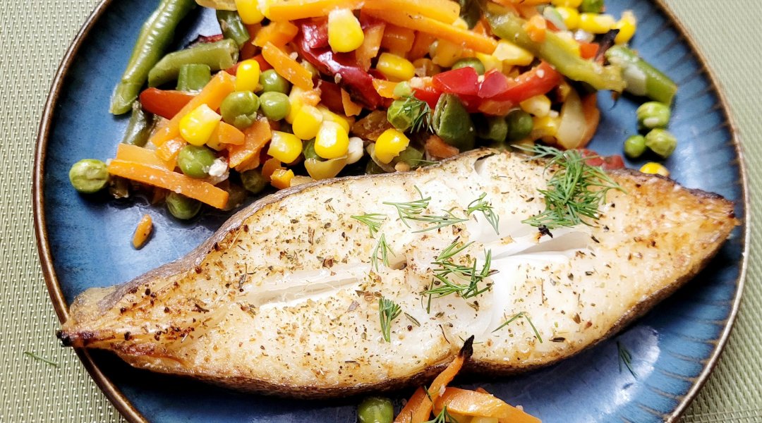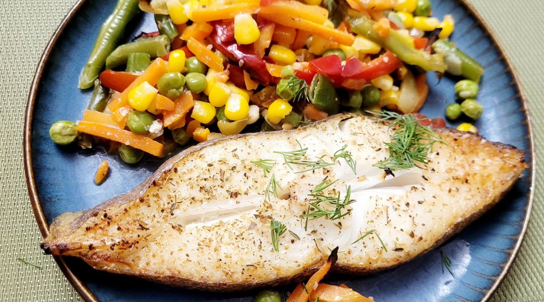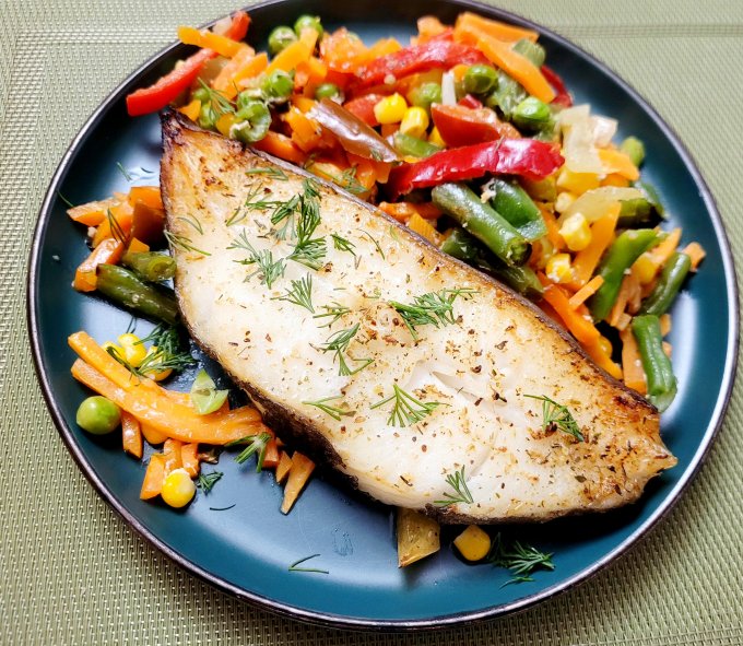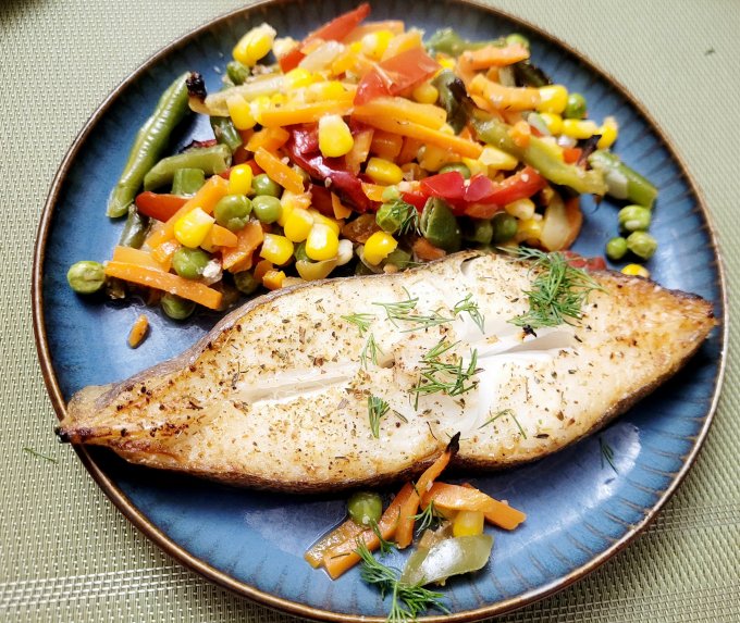 | Палтус запеченый с овощами,мексиканская смесь |