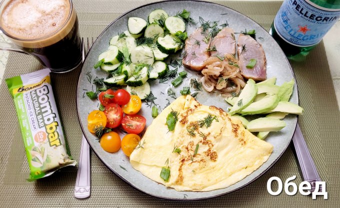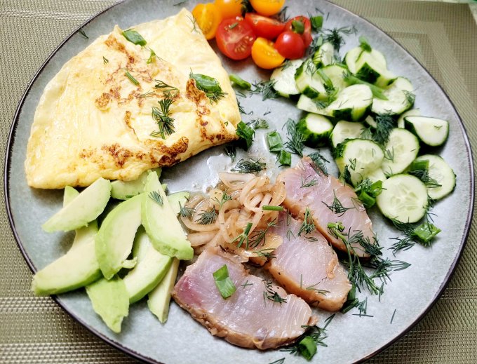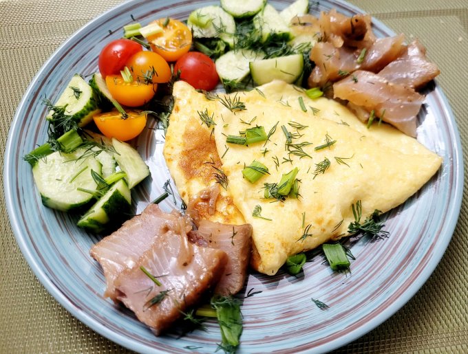 | Омлет ,нельма,авокадо,огурец, помидор, зелень |