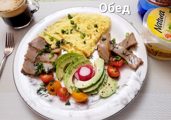 | Омлет,нельма,авокадо,редис,черри,зелень |