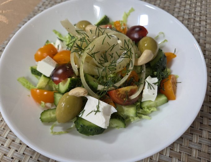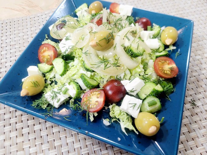 | Салат,пекинка,огурец,помидор,сыр,оливки с кешью,лук,укроп |