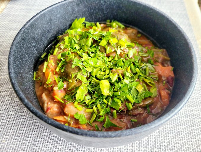 | Овощи тушеные, цукини,морковь, лук, чеснок, фасоль, соус помидорный, зелень |