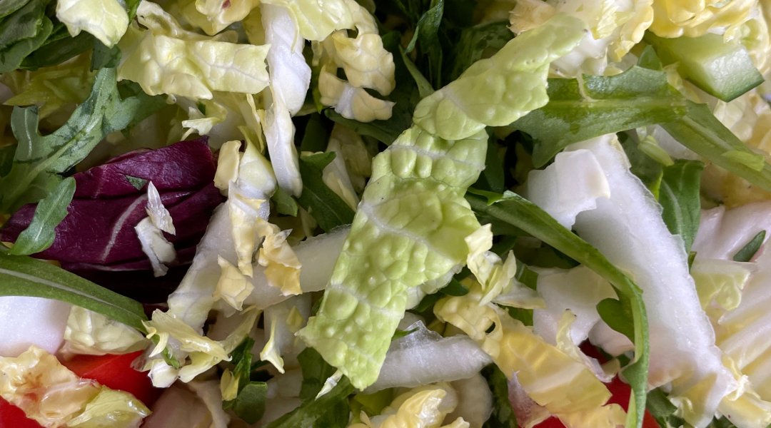 Помыть овощи зелень взвесить и хаотично нарезать. Салат готов!!